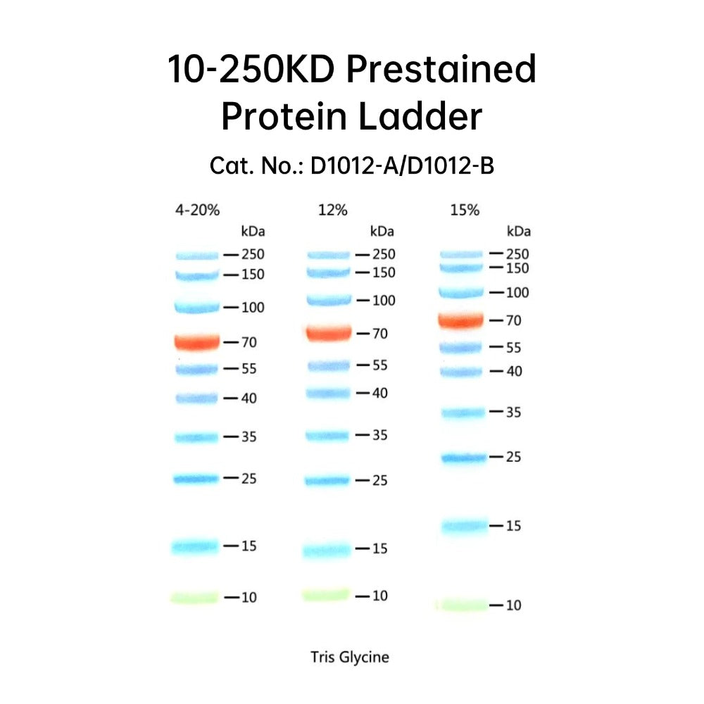 This product contains 10 pre-stained standard proteins with known molecular weights, ranging from 10kDa to 250kDa. The 70kDa band is marked with an orange protein band, and the 10kDa band is marked with a green protein band, while the others are blue. It allows for direct observation of the protein electrophoresis process and a clear assessment of the Western blot transfer effect. Typically, a sample volume of 5µl per application is adequate.