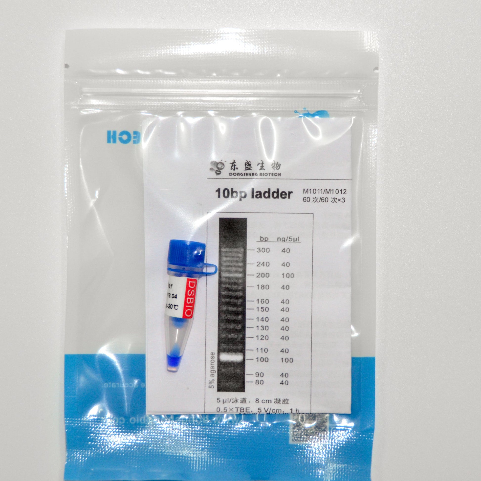 10bp Ladder is an ideal DNA Ladder for determining the size of double-stranded DNA (dsDNA) from 80 to 300 base pairs (bp) in high percentage agarose or non-denaturing polyacrylamide gels. The ladder consists of 18 linear dsDNA fragments. It is a 10 bp step ladder, especially useful for determining 10 bp differences between DNA fragments. The 100bp and 200bp fragments are present at increased intensity to allow easy identification. All fragments are precisely quantified and mixed during the production. This ladder is pre-mixed with loading dye and is ready to use.