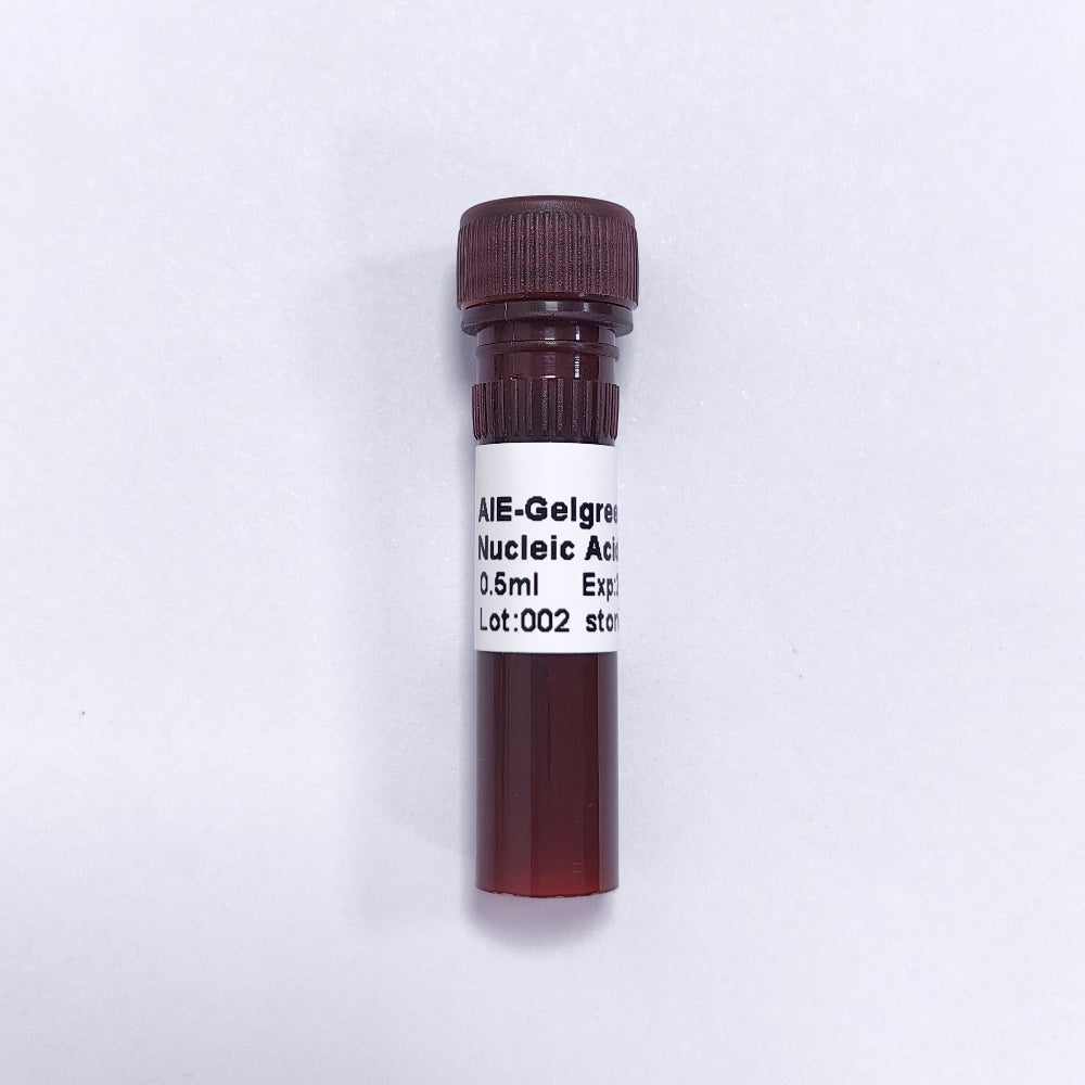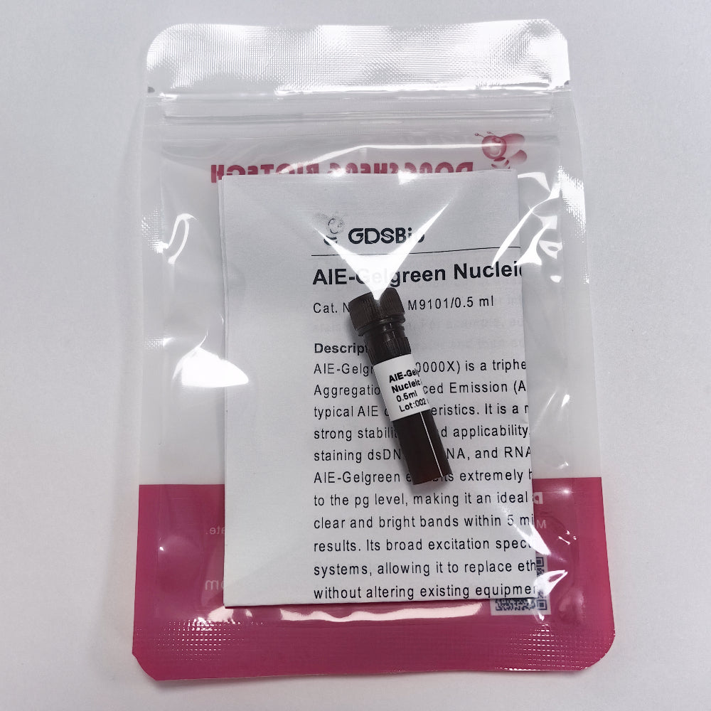 AIE-Gelgreen Nucleic Acid Stain (10,000X) is a triphenylamine derivative based on Aggregation-Induced Emission (AIE) fluorescent materials, possessing typical AIE characteristics. It is a nucleic acid gel stain with high sensitivity, strong stability, broad applicability, and excellent compatibility, suitable for staining dsDNA, ssDNA, and RNA in agarose and polyacrylamide gels. AIE-Gelgreen exhibits extremely high sensitivity, with a detection limit as low as 1 ng, making it an ideal alternative to silver staining. It can produce clear and bright bands within 5 minutes, with simple operation and intuitive results. Its broad excitation spectrum is compatible with various imaging systems, allowing it to replace ethidium bromide (EB) and other gel stains without altering existing equipment. It is suitable for gel imaging and detection systems originally using nucleic acid stains such as SYBR Green or SYBR Gold. Moreover, AIE-Gelgreen can be used for nucleic acid detection with harmless blue light lamps or blue light imaging devices, avoiding the mutagenic effects of conventional UV detection on nucleic acid samples as well as the harm to the eyes and skin from UV exposure, making it an ideal choice for use with laser scanners.