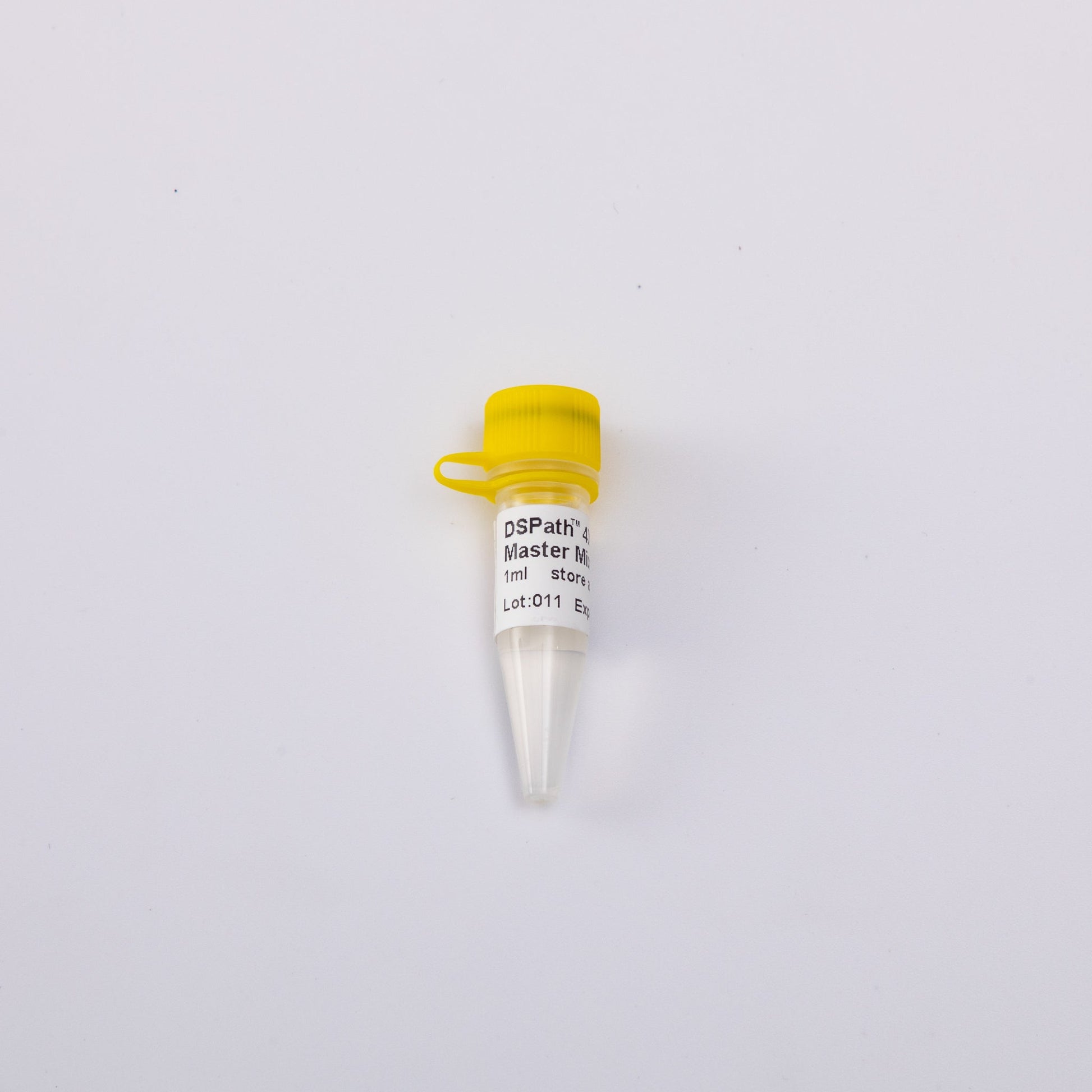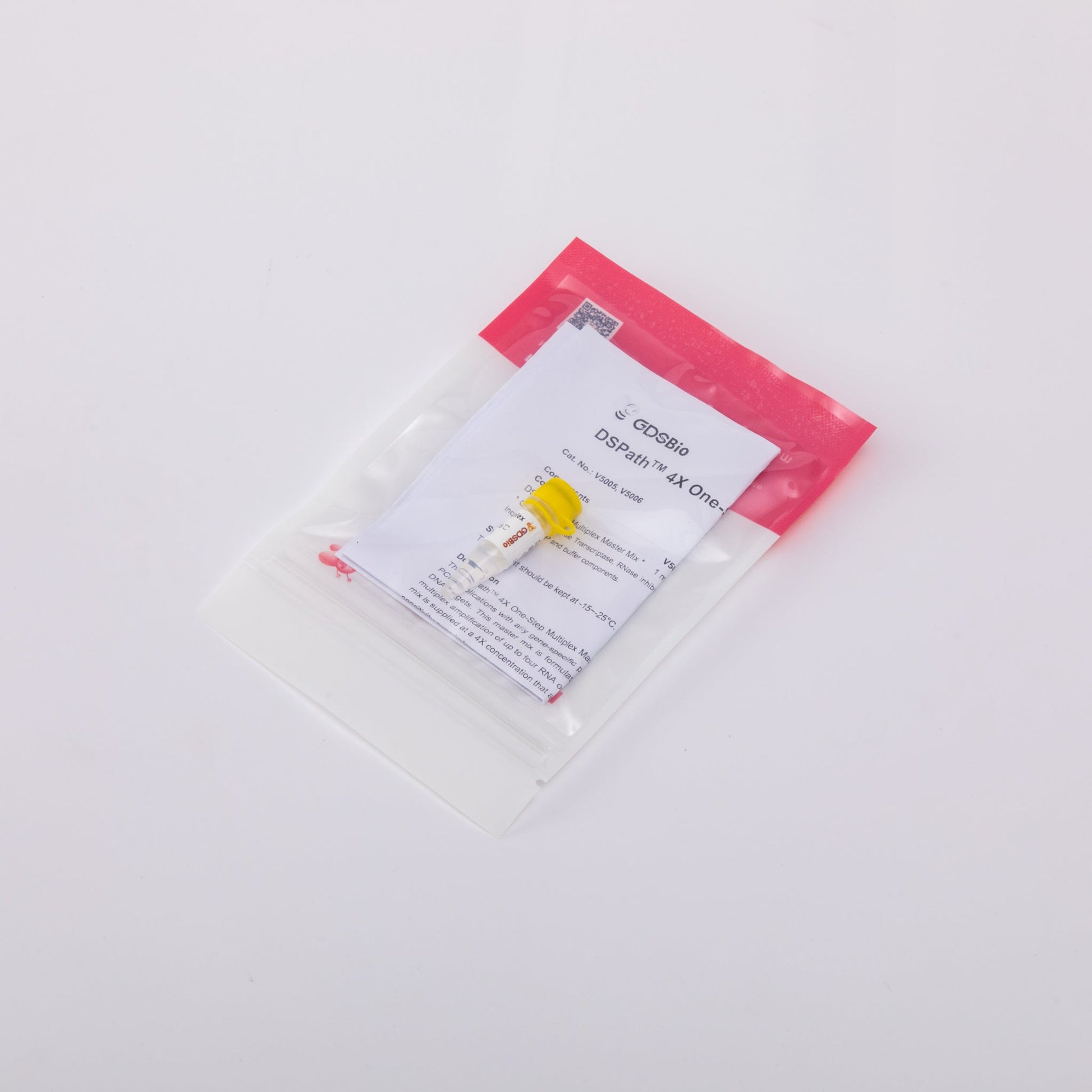 DSPath 4X One-Step Multiplex Master Mix is used to perform one-step multiplex real-time PCR applications with any gene-specific primer and probe sets, and is suitable for both RNA and DNA targets. This master mix is formulated with optimized buffer components to accommodate multiplex amplification of up to four RNA or DNA target sequences in a single reaction. The master mix is supplied at a 4X concentration that allows to input more sample into each reaction, increasing sensitivity even in low-volume reactions.