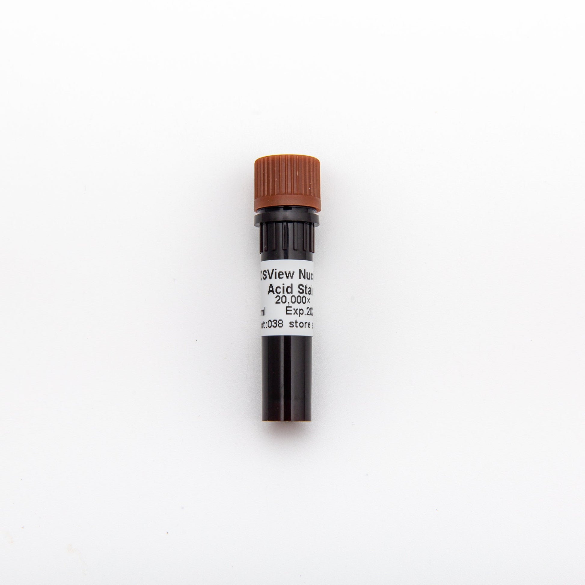 DSView Nucleic Acid Stain (20,000X) is a new nucleic acid stain, and alternative to the traditional ethidium bromide (EB) stain for detecting nucleic acid in agarose gels. It emits green fluorescence when bound to DNA or RNA. This new stain has two fluorescence excitation maxima. When bound to nucleic acid, one centered at 267nm and another at 294nm. In addition, it has one visible excitation at 491nm. The Fluorescence emission of DSViewTM bound to DNA is centered at 530nm.