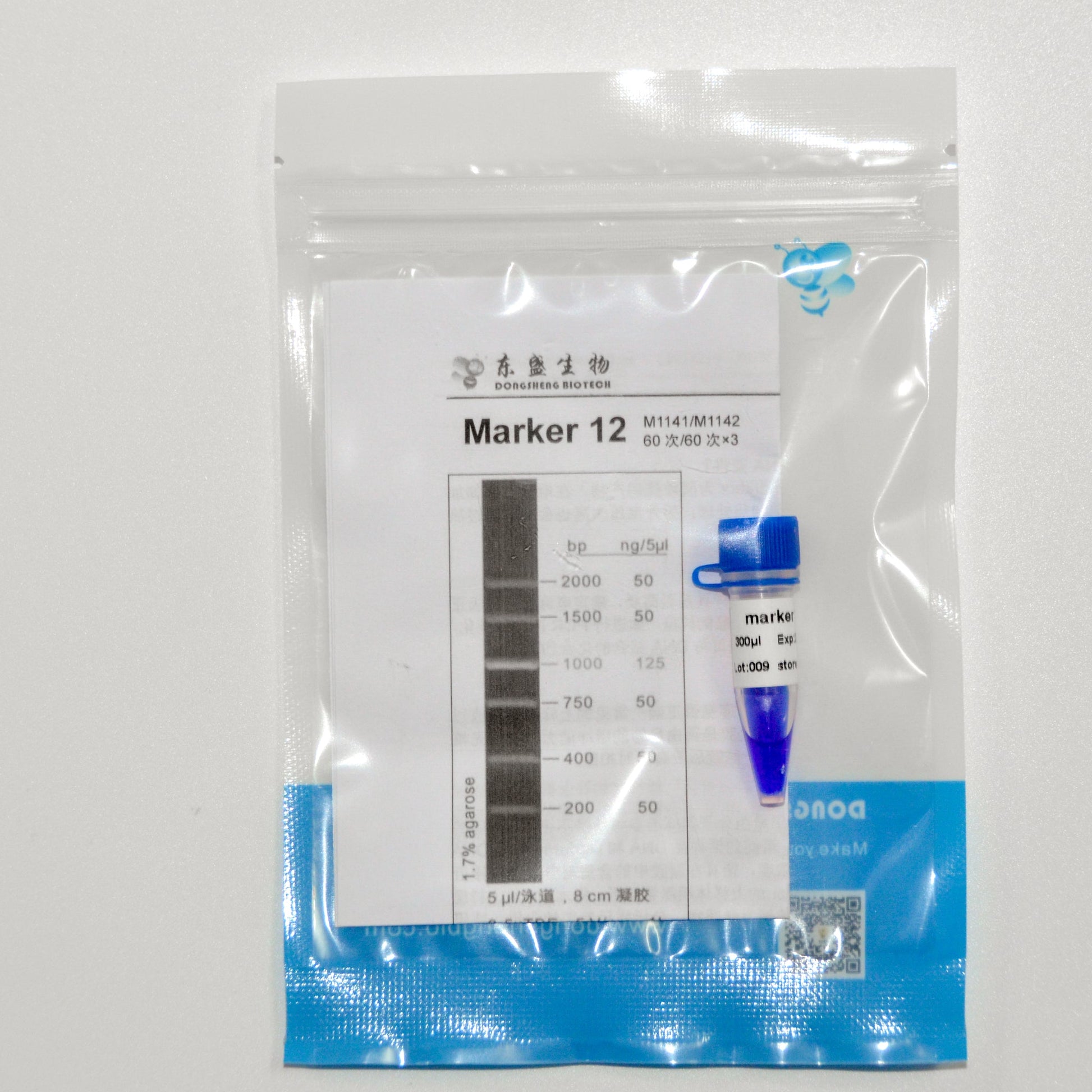 Marker 12 is an ideal DNA Marker for determining the size of double-stranded DNA (dsDNA) from 200 to 2,000 base pairs (bp). The ladder consists of 6 linear dsDNA fragments. The 1,000bp fragment is present at increased intensity to allow easy identification. All fragments are precisely quantified and mixed during the production. This ladder is pre-mixed with loading dye and is ready to use.